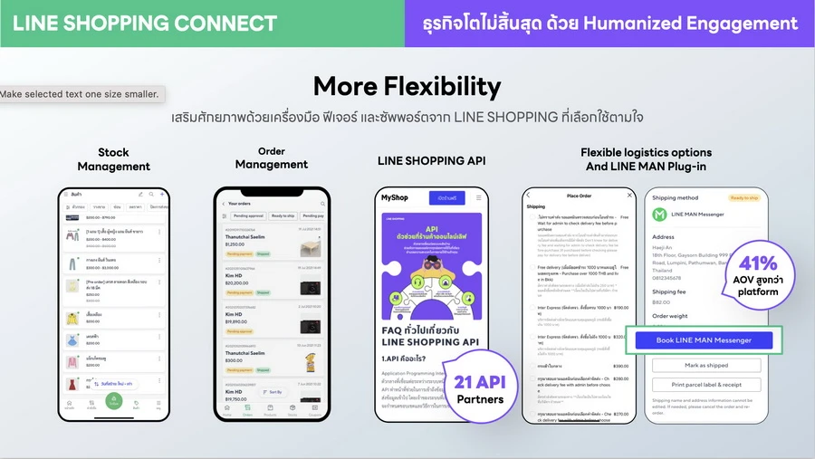 • More Flexibility การเสริมศักยภาพร้านค้าด้วยเครื่องมือ ฟีเจอร์ และการขนส่งที่สามารถเลือกใช้ได้ตามใจ ล่าสุด LINE SHOPPING ได้จับมือกับ 21 พันธมิตร เพื่อพัฒนาความสามารถในการจัดการออเดอร์ให้ดียิ่งขึ้น โดยหนึ่งในนั้น คือ LINE MAN MESSENGER ผู้ช่วยอันดับหนึ่งของร้านค้าออนไลน์และออฟไลน์ ด้วยบริการส่งของด่วนภายใน 1 วัน เพื่อตอบโจทย์เทรนด์นักช้อปที่ต้องการรับของแบบทันใจ