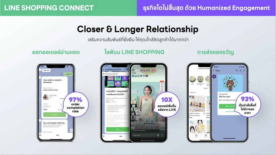 • Closer & Longer relationship การเสริมความสัมพันธ์ที่ยั่งยืน ให้ร้านค้าใกล้ชิดลูกค้าได้มากกว่า ผ่านฟีเจอร์การขายอย่าง การออกออเดอร์ผ่านแชต, ไลฟ์บน LINE SHOPPING และการส่งของขวัญ