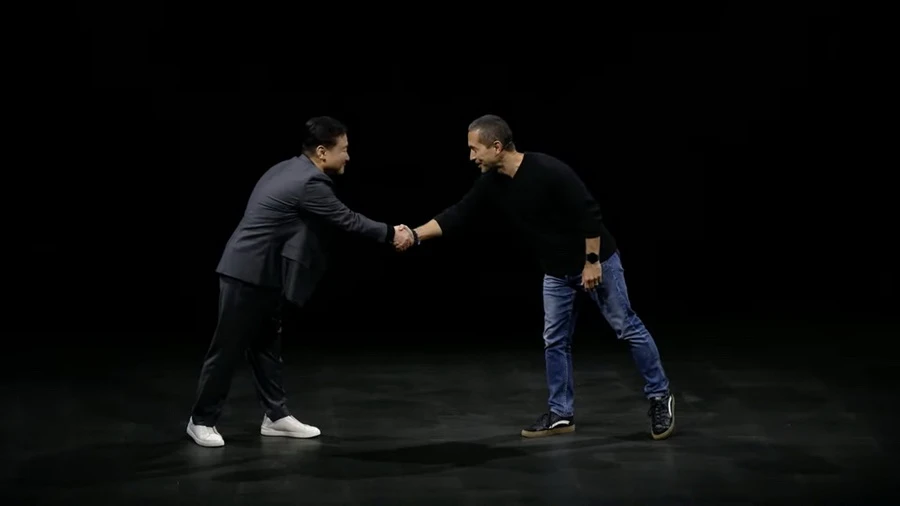 จากซ้าย ทีเอ็ม โรห์ ประธานธุรกิจโมบายล์ เอ็กซ์พีเรียนซ์ ซัมซุง อิเลคโทรนิคส์ และ ฮิโรชิ ล็อคไฮเมอร์ รองประธานอาวุโสฝ่ายแพลตฟอร์มและอีโคซิสเต็มของ Google