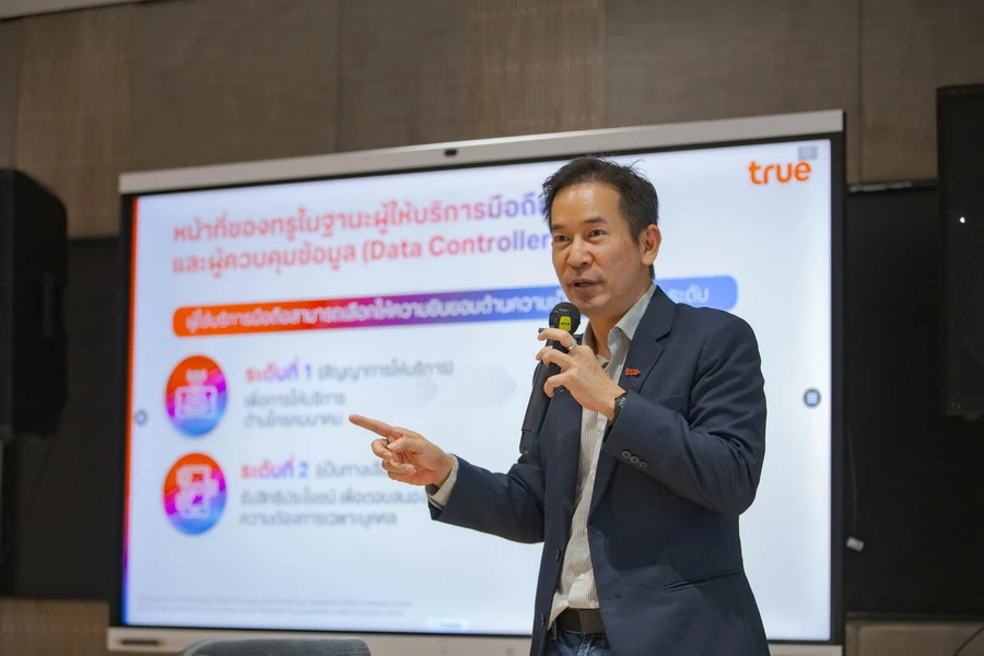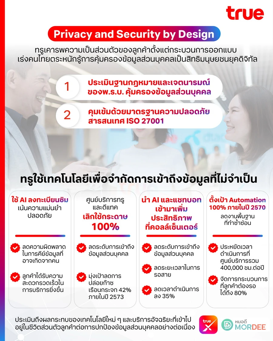 นายมนตรี สถาพรกุล หัวหน้าฝ่ายคุ้มครองข้อมูลส่วนบุคคล บมจ. ทรู คอร์ปอเรชั่น กล่าวว่า "ทรู คอร์ปอเรชั่น ในฐานะผู้นำด้านโทรคมนาคม ตระหนักถึงการดำเนินธุรกิจอย่างมีความรับผิดชอบและรักษาความปลอดภัยข้อมูลส่วนบุคคลของลูกค้า อันเป็นการเคารพสิทธิมนุษยชนอีกมิติหนึ่งในยุคดิจิทัล ซึ่งถือเป็นหนึ่งในประเด็นด้านความยั่งยืนที่กลุ่มผู้มีส่วนได้เสียของทรูให้ความสำคัญในระดับสูงมาก โดยยึดกลยุทธ์ “Privacy and Security by Design” ซึ่งเป็นการเคารพสิทธิความเป็นส่วนตัวที่ปกป้องข้อมูลลูกค้าให้ปลอดภัยตั้งแต่ขั้นตอนการออกแบบ พร้อมคุมเข้มความปลอดภัยสารสนเทศ ด้วยมาตรฐานสากล ISO 27001 และเน้นการใช้เทคโนโลยีเพื่อจำกัดการเข้าถึงข้อมูลส่วนบุคคลที่ไม่จำเป็น เช่น การใช้ AI ในการลงทะเบียนซิมเพื่อความแม่นยำและปลอดภัย การเปลี่ยนเอกสารไปเป็นดิจิทัล เลิกใช้กระดาษ 100% นำ AI และแชทบอทเข้ามาเพิ่มประสิทธิภาพในการให้บริการลูกค้า เพื่อลดระยะเวลารอและลดระดับการเข้าถึงข้อมูลส่วนบุคคล"