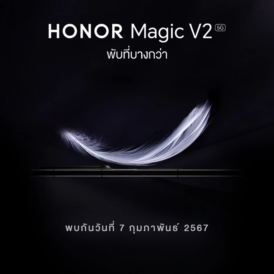 ห้ามพลาด! เตรียมสัมผัสกับความมหัศจรรย์แห่งความบางและเบาที่สุด ครั้งแรกในประเทศไทย ในงานแถลงข่าวเปิดตัวสมาร์ตโฟนจอพับรุ่นใหม่ HONOR Magic V2 และโปรโมชันสุดพิเศษ พร้อมกันในวันพุธที่ 7 กุมภาพันธ์ 2567 เวลา 14.00 น. ผ่านทาง Facebook และ YouTube Live HONOR Thailand โดยจะเริ่มพรีออเดอร์พร้อมโปรโมชันพิเศษระหว่างวันที่ 8 - 12 กุมภาพันธ์ และเริ่มวางจำหน่ายสินค้าที่ร้านตัวแทนจำหน่ายทั่วประเทศในวันที่ 13 กุมภาพันธ์ 2567