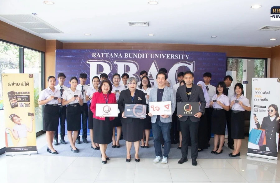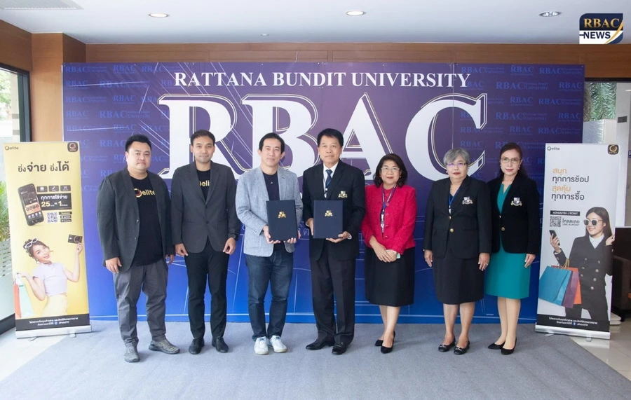 คุณธนวัฒน์ เลิศวัฒนารักษ์ (ที่ 3 จากซ้าย) ประธานเจ้าหน้าที่บริหาร บริษัท เจ อีลิท จำกัด และ คุณมนตรี ไชยพันธุ์ (ที่ 4 จากซ้าย) รองอธิการบดีมหาวิทยาลัยรัตนบัณทิต (RBAC) ร่วมลงนามบันทึกข้อตกลงร่วมกันผลักดันด้านนวัตกรรมและเทคโนโลยี ซึ่งนับเป็นการเริ่มต้นความร่วมมือเพื่อนำไปสู่การเป็น SMART University ที่ผสมผสานนวัตกรรมและเทคโนโลยีไปด้วยกันอย่างยังยืนต่อไป ณ มหาวิทยาลัยรัตนบัณฑิต(RBAC) เมื่อวันก่อน
