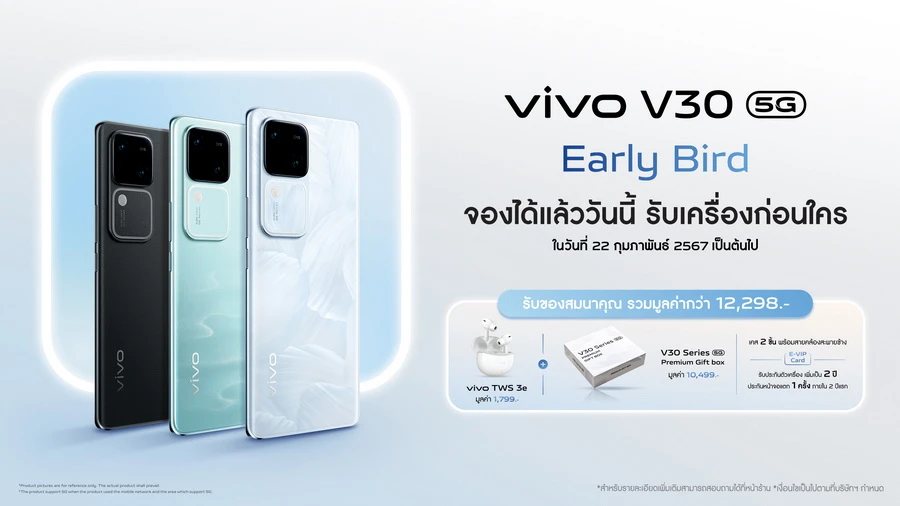พิเศษสำหรับแฟน ๆ วีโว่ vivo V30 5G และ V30 Pro 5G จะเปิดให้ผู้ที่สนใจได้จับจองเป็นเจ้าของก่อนใครในรอบ Early Bird โดยมีรายละเอียดดังนี้