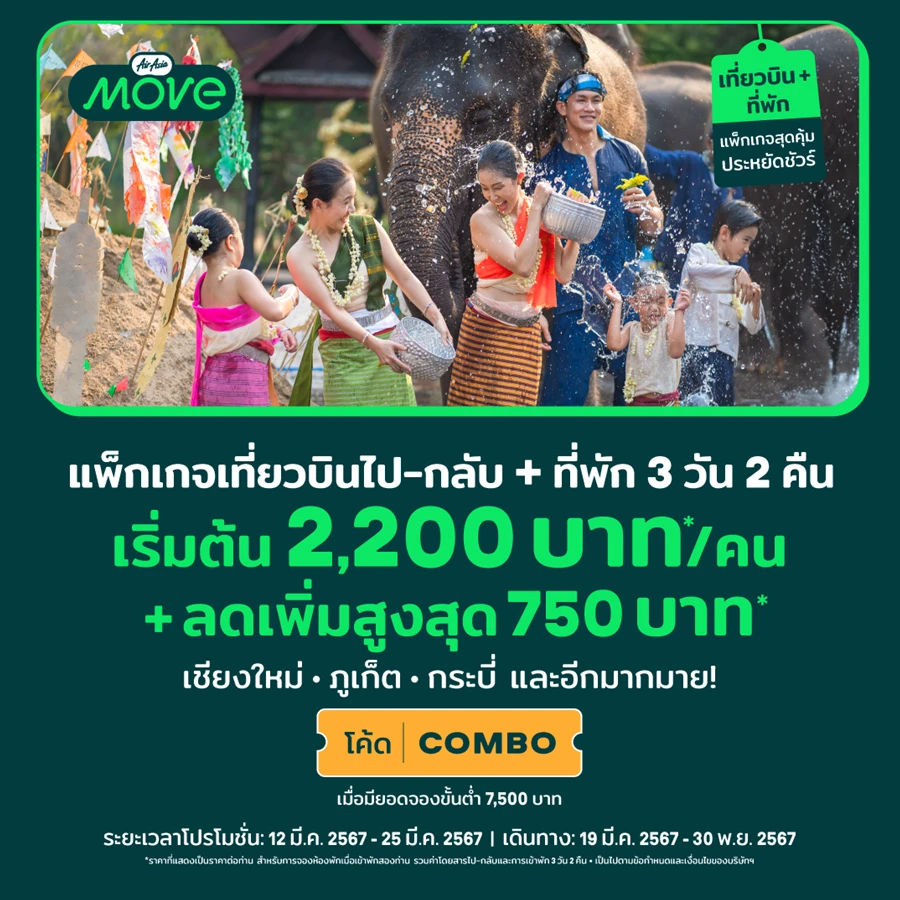 สำหรับแพ็กเกจเที่ยวบิน+ที่พัก เรามอบข้อเสนอราคาพิเศษที่คุ้มกว่าเมื่อจองโรงแรมและเที่ยวบินพร้อมกัน นอกจากนี้เรายังประกาศแพ็กเกจสุดพิเศษต้อนรับเทศกาลสงกรานต์ ด้วยการจองตั๋วเครื่องบิน+ที่พัก 3 วัน/2 คืน ทั่วไทย เพียงทำการจองผ่าน AirAsia MOVE ในราคาเริ่มต้นเพียง 2,200 บาท ต่อท่าน พร้อมส่วนลดเพิ่ม 750 บาท* เพียงใส่รหัสโปรโมชั่น (COMBO)