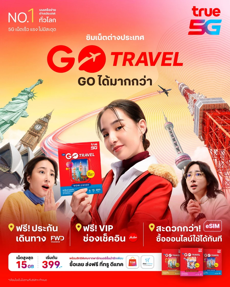 ปรากฎการณ์โรมมิ่งครั้งใหม่สำหรับนักเดินทาง!...ทรู คอร์ปอเรชั่น มอบประสบการณ์ท่องเที่ยวที่มากกว่าบริการการโรมมิ่ง (Beyond Roaming) เปิดตัวซิมและแพ็กเกจเน็ตต่างประเทศใหม่ภายใต้ชื่อเดียวคือ “GO Travel” ให้ลูกค้าทั้งทรูและดีแทค เดินทางท่องโลกสัมผัสประสบการณ์ระดับเวิล์ดคลาส สื่อสารไม่สะดุด โดยร่วมกับกว่า 700+ พันธมิตรผ่านเครือข่ายอันดับ 1 ทั่วโลก และเป็นครั้งแรกของวงการโรมมิ่งไทย ที่ให้ใช้อินเทอร์เน็ตบนเครื่องบินฟรี กับ 25 สายการบินชั้นนำทั่วโลก กับแพ็กเกจเน็ตต่างประเทศ GO Travel ทั้งรายเดือนและเติมเงิน พร้อมรับสิทธิพิเศษเหนือชั้นมากมาย อาทิ ทรูร่วมกับ FWD ประกันชีวิตมอบประกันการเดินทาง บริการ Red Carpet ช่องเช็คอินพิเศษ และบริการเดินทางสุด VIP จาก AirAsia รวมถึงบริการผู้ช่วยส่วนตัวและรถกอล์ฟไฟฟ้าที่สนามบินสุวรรณภูมิ จาก Airport Premium Service โดยทั้งหมดเป็นบริการที่ให้ลูกค้าฟรี นอกจากนี้ยังมอบส่วนลดสูงสุด 50% เมื่อใช้บริการห้องรับรองสนามบินจาก True You และ dtac Reward