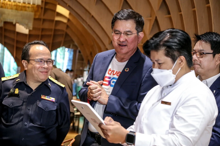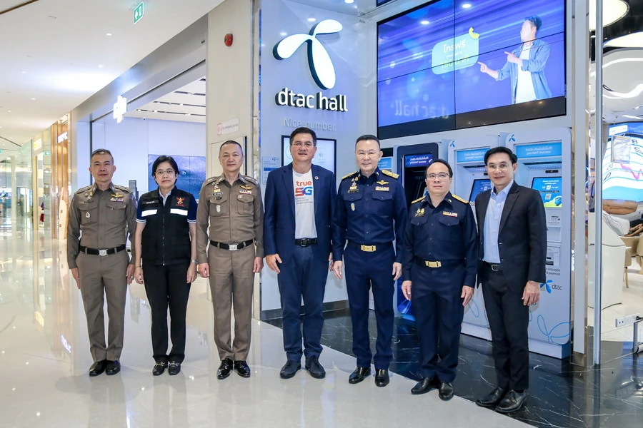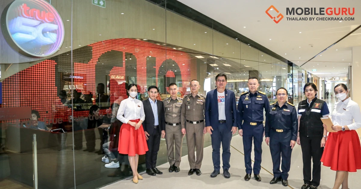 สำนักงานคณะกรรมการกิจการกระจายเสียง กิจการโทรทัศน์ และกิจการโทรคมนาคมแห่งชาติ โดย พล.ต.อ ณัฐธร เพราะสุนทร (ที่ 4 จากขวา) กรรมการด้านกฎหมาย และประธานอนุกรรมการบูรณาการบังคับใช้กฎหมายความผิดทางเทคโนโลยี กสทช. และ นายสุทธิศักดิ์ ตันตะโยธิน (ที่ 3 จากขวา) รองเลขาธิการ กสทช. พร้อมด้วย พลตำรวจโท ธัชชัย ปิตะนีละบุตร ผู้ช่วยผู้บัญชาการตำรวจแห่งชาติ ดูแลงานด้านอาชญากรรมเทคโนโลยี / อนุกรรมการบูรณาการฯ สำนักงานตำรวจแห่งชาติ (ที่ 4 จากซ้าย) เดินทางมาตรวจเยี่ยมทรูช็อป เพื่อติดตามความคืบหน้าการลงทะเบียนเลขหมายโทรศัพท์เคลื่อนที่และการยืนยันตัวตนของผู้ใช้บริการที่ถือครองเลขหมายเกินกว่า 6 เลขหมายขึ้นไป เพื่อป้องกันมิจฉาชีพนำไปใช้ในการก่ออาชญากรรมออนไลน์ โดยมี นายจักรกฤษณ์ อุไรรัตน์ (ที่ 5 จากซ้าย) หัวหน้าคณะผู้บริหารด้านกิจการองค์กร บมจ. ทรู คอร์ปอเรชั่น ให้การต้อนรับพร้อมสาธิตวิธีการยืนยันตัวตน และนำชมเทคโนโลยีที่ได้พัฒนาและวางระบบยืนยันตัวตนที่มีความปลอดภัยขั้นสูง เพื่ออำนวยความสะดวกจากนโยบายดังกล่าวให้กับลูกค้าทรูมูฟ เอช และดีแทค ทั้งแบบรายเดือนและแบบเติมเงินอย่างเต็มที่ ณ ทรู แบรนดิ้ง ช็อป ศูนย์การค้าสยามพารากอน