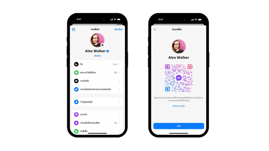 ผู้ใช้สามารถให้อีกฝ่ายเพิ่มเป็นเพื่อนทาง Messenger ได้ง่าย ๆ โดยไปที่การตั้งค่าและกดเลือกไอคอน QR code ด้านบน จากนั้นให้เพื่อนสแกน QR code ด้วยกล้องถ่ายภาพบนมือถือ หรือส่งลิงก์ให้อีกฝ่ายโดยการกด 'แบ่งปัน' (Share)