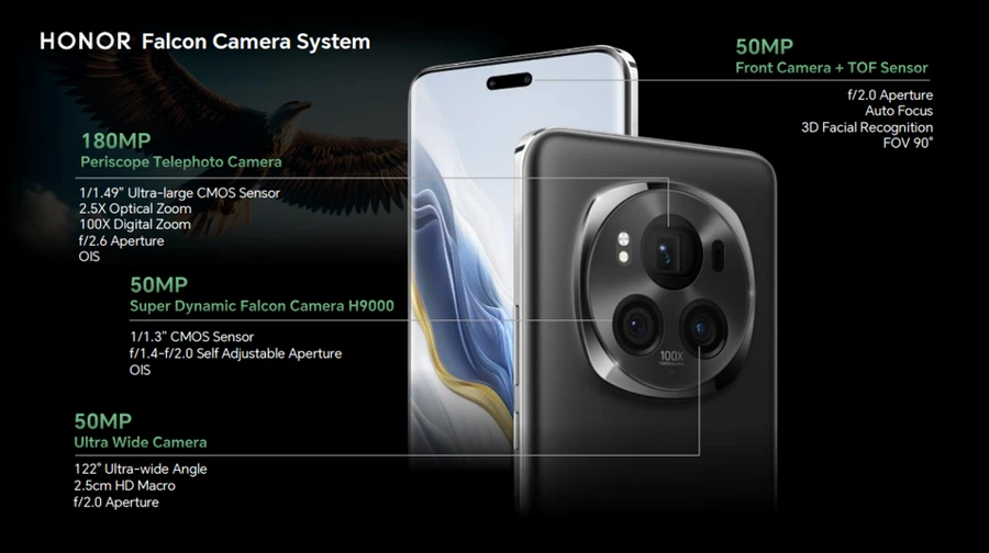 HONOR Magic6 Pro นำเสนอนวัตกรรมด้านการถ่ายภาพอัจริยะด้วยเทคโนโลยีกล้อง AI ที่ให้คุณภาพของภาพถ่ายสวยคมชัด ด้วยการผสานระบบกล้อง Falcon Camera และ AI Motion Sensing Capture ช่วยให้ผู้ใช้สามารถถ่ายภาพที่มีการเคลื่อนไหวรวดเร็วได้อย่างสมบูรณ์แบบและได้ภาพถ่ายที่มีคุณภาพสูง พร้อมเลนส์กล้องถึง 3 ตัว ได้แก่ Periscope Telephoto ความละเอียด 180MP อัลตร้าไวด์ความละเอียด 50MP และ Super Dynamic Falcon H9000 ความละเอียด 50MP