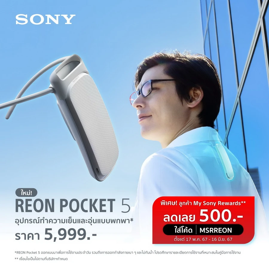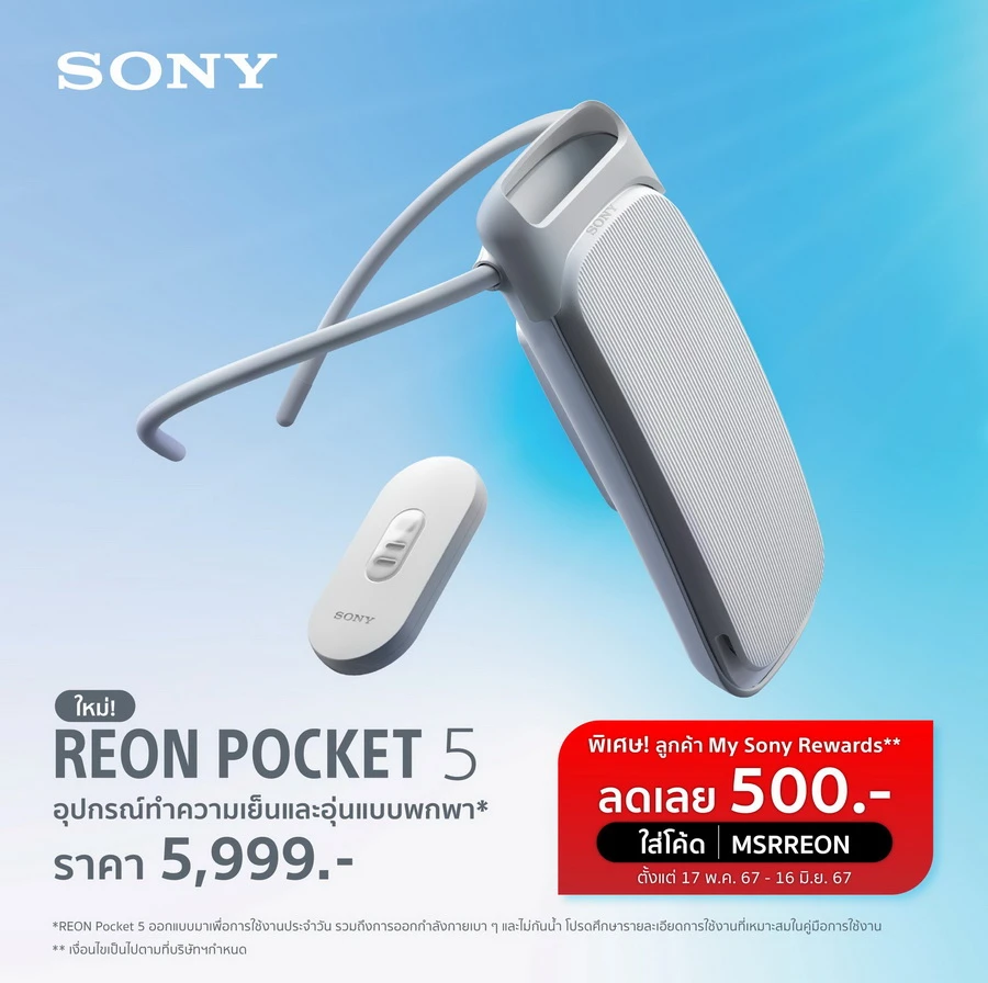 โซนี่ไทยพร้อมวางจำหน่าย REON POCKET 5 ตั้งแต่วันที่ 17 พ.ค. 67 ในราคาพิเศษเครื่องละ 5,499 บาท (ปกติ 5,999 บาท) สำหรับลูกค้า My Sony ตั้งแต่วันที่ 17 พ.ค. 67 – 16 มิ.ย. 67 โดยจะวางจำหน่ายที่โชว์รูมโซนี่สโตร์ ทั้ง 6 สาขา ได้แก่ โซนี่ สโตร์-เซ็นทรัลพระราม 9 โซนี่ สโตร์-พารากอน โซนี่ สโตร์-เอ็มควาเทียร์ โซนี่ สโตร์-เดอะมอลล์บางกะปิ โซนี่ สโตร์-ฟิวเจอร์พาร์ค และโซนี่ สโตร์-เดอะมอลล์บางแค รวมถึงช่องทางออนไลน์ https://store.sony.co.th/products/reon-pocket-5