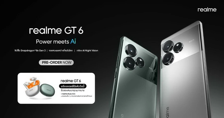 เตรียมสัมผัสนวัตกรรมสุดล้ำที่จะกำหนดนิยามใหม่ของวงการสมาร์ตโฟน realme GT 6 กำหนดเปิดตัวที่เมืองมิลาน ประเทศอิตาลี ในวันที่ 20 มิถุนายนนี้ ถ่ายทอดสดผ่านทาง Facebook : realmeTH, YouTube : realme Thailand, TIKTOK : realme_thailand เวลา 15.00 น. เป็นต้นไป และเรียลแฟนสามารถจับจองเพื่อเป็นเจ้าของได้ก่อนใคร โดยสามารถพรีออเดอร์ (Blind order) เริ่มต้นเพียง 500 บาท พร้อมรับหูฟัง realme Buds Air 6 มูลค่า 1,999 บาทฟรี! ตั้งแต่วันนี้เป็นต้นไปผ่านช่องทางที่กำหนด