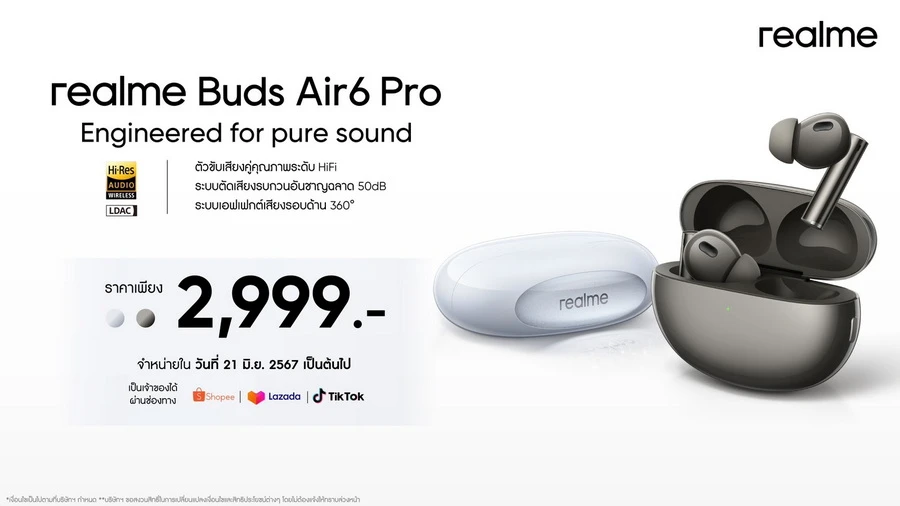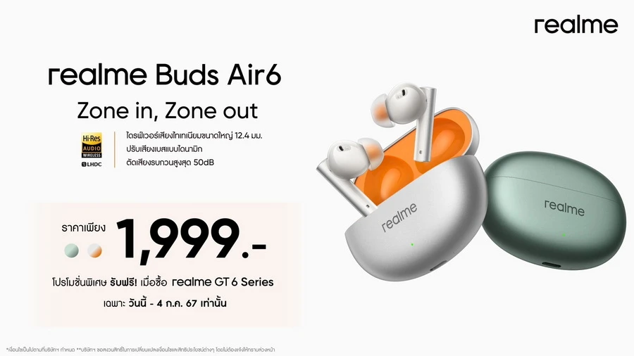 realme Buds Air6 series นำเสนอทั้ง realme Buds Air6 และ Pro Buds Air6 Pro โดย realme Buds Air 6 เปิดตัวในราคา 1,999 บาท พรัอมโปรโมชั่นพิเศษ รับ realme Buds Air 6 ฟรีทันที! เมื่อซื้อ realme GT 6 Series เฉพาะวันนี้ - 4 กรกฎาคมเท่านั้นผ่านช่องทาง realme Brand Shop และตัวแทนจำหน่ายที่กำหนด
