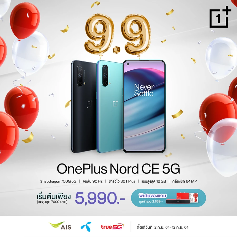 ต้อนรับเทศกาล 9.9 ทาง OnePlus ให้คุณเป็นเจ้าของ OnePlus Nord CE 5G ลดสูงสุด 7,000 บาท เริ่มเพียง 5,990 บาท พร้อมของแถมสุดพิเศษมูลค่ารวมกว่า 2,189 บาท ได้ตั้งแต่วันที่ 2 - 12 กันยายน 2564 ซื้อออนไลน์ รอรับสบาย ๆ ที่บ้าน