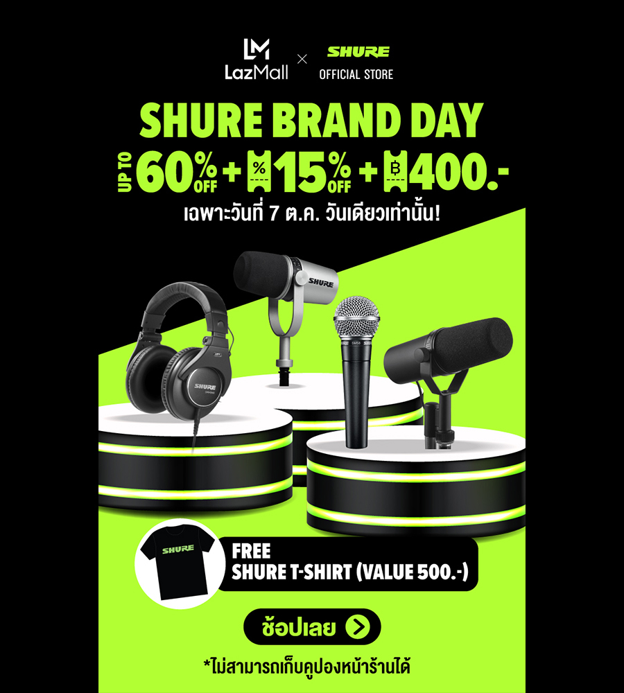 บริษัท มหาจักรดีเวลอปเมนท์ จำกัด จัดแคมเปญ Lazada Shure Brand Day สินค้า Professional Audio แบรนด์ Shure ยกทัพสินค้ามาให้ Shop กันอย่างจุใจ กับโปรโมชั่นลดราคาสูงสุด 60% ทั้งสินค้าไมค์ และหูฟัง พิเศษสำหรับทุกคำสั่งซื้อ รับฟรี! เสื้อยืด Shure มูลค่า 500 บาท เฉพาะวันที่ 7 ตุลาคม 2564 นี้เท่านั้น!