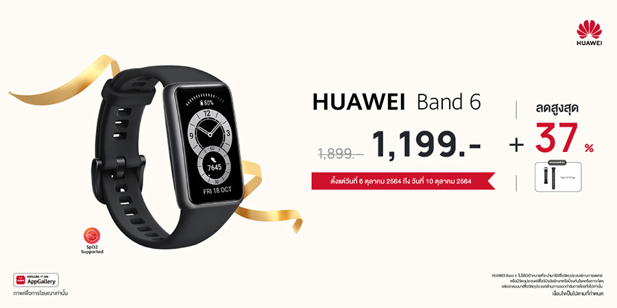 - HUAWEI Band 6 สมาร์ทแบนด์ที่โดดเด่นด้วยหน้าจอขนาดใหญ่ 1.47 นิ้ว ดีไซน์โฉบเฉี่ยวทันสมัย อัดแน่นด้วยโหมดออกกำลังกายจุใจ 98 โหมด ซึ่งรวมถึงกีฬาฮอตฮิตอย่างสเก็ตบอร์ดและกระโดดเชือก พร้อมฟีเจอร์วัดค่าต่างๆ ไม่ว่าจะเป็นการวัดอัตราการเต้นของหัวใจระหว่างออกกำลังกาย การวัดค่าความอิ่มตัวของออกซิเจนในเลือด (SpO2) ระหว่างออกกำลังกาย รวมถึงสามารถติดตามคุณภาพการนอนหลับและติดตามรอบประจำเดือน ใช้งานต่อเนื่องได้นานสูงสุด 14 วัน ลดราคาถึง 37% เหลือเพียง 1,199 บาท จากราคาปกติ 1,899 เมื่อสั่งซื้อสินค้าผ่านทางเว็บไซต์ HUAWEI Store ระหว่างวันที่ 6 - 10 ตุลาคม 2564