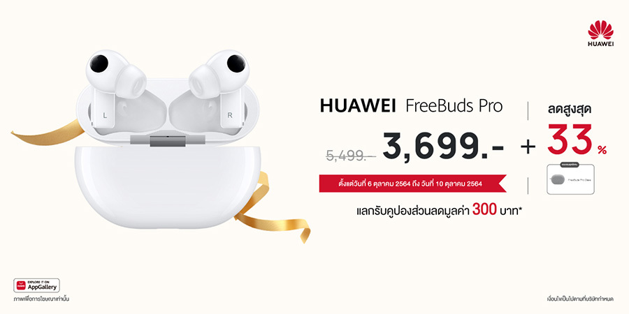 - HUAWEI FreeBuds Pro หูฟังไร้สายตัวท็อปที่สุดแห่งโลกไร้เสียงรบกวน มาพร้อมเทคโนโลยีตัดเสียงรบกวนรอบข้าง Active Noise Cancellation แบบไดนามิกอัจฉริยะ รองรับการเชื่อมต่อสองอุปกรณ์ได้พร้อมกัน ที่ผสานพลังไมโครโฟน 3 ตัว ตัดเสียงรบกวนได้สูงสุดถึง 40 เดซิเบล พร้อมโหมด Awareness ที่สามารถสลับไปรับฟังเสียงคนรอบข้างได้โดยไม่ต้องถอดหูฟังออก แถมยังเชื่อมต่ออย่างมีเสถียรภาพ โดยรองรับการเชื่อมต่อสองอุปกรณ์ได้พร้อมกัน ลดราคา 33% เหลือเพียง 3,699 บาท จากราคาปกติ 5,499 บาท เมื่อสั่งซื้อสินค้าผ่านทางเว็บไซต์ HUAWEI Store ระหว่างวันที่ 6 - 10 ตุลาคม 2564