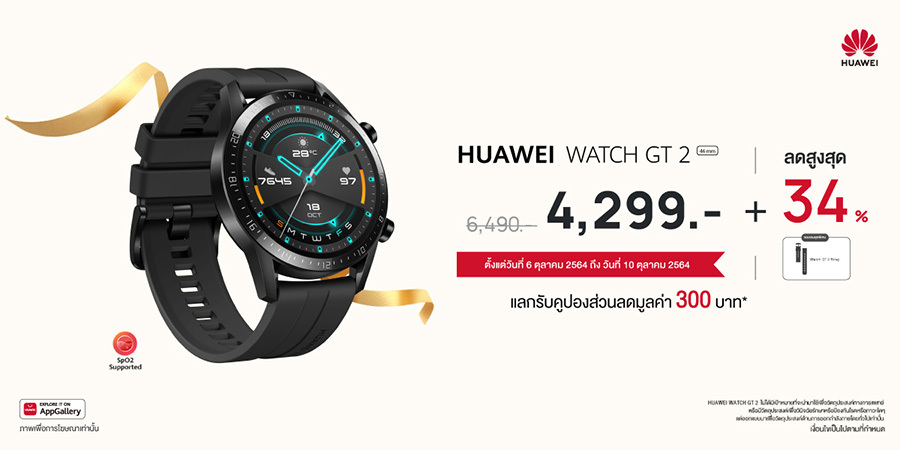 - HUAWEI WATCH GT 2 สมาร์ทวอชท์แบตอึดสำหรับคนรักสุขภาพและการออกกำลังกาย ใช้งานต่อเนื่องได้นานสูงสุด 2 สัปดาห์ คอยติดตามสุขภาพและการออกกำลังกายเสมือนมีเทรนเนอร์ติดตัว โดย HUAWEI WATCH GT 2 46mm รุ่น Sport (สี Matte Black) ลดราคาสูงถึง 34% เหลือเพียง 4,299 บาท จากราคาปกติ 6,490 บาท แถมยังรับฟรีทันทีสายนาฬิกามูลค่า 590 บาท ให้ไปเปลี่ยนใส่กันได้แบบไม่ซ้ำสไตล์ในแต่ละวัน เมื่อสั่งซื้อสินค้าผ่านทางเว็บไซต์ HUAWEI Store ระหว่างวันที่ 6 - 10 ตุลาคม 2564