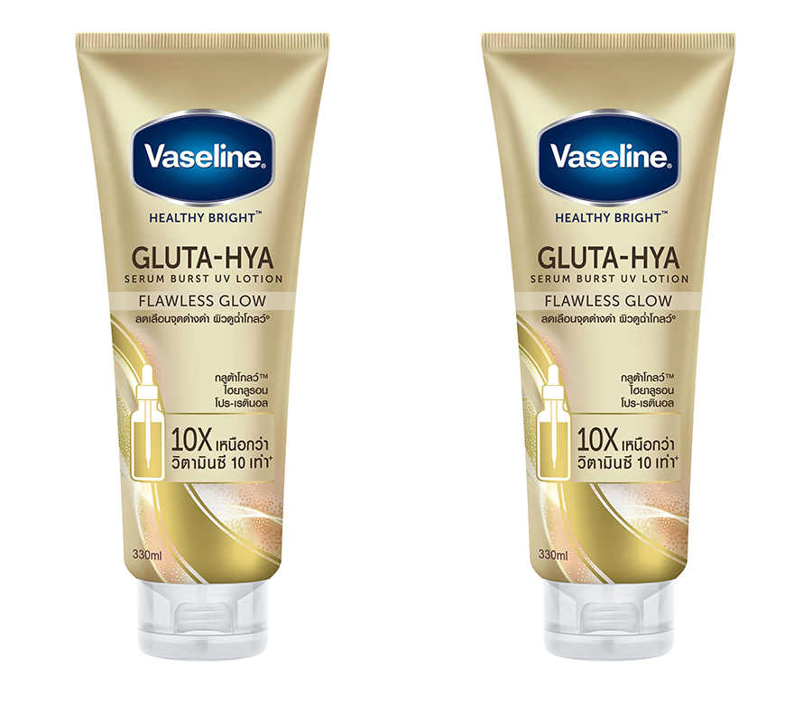 - Vaseline กับไอเท็มที่ช่วยลดเลือนจุดด่างดำ ทำให้สีผิวดูสม่ำเสมอ Vaseline Healthy Bright Gluta-Hya Serum Burst UV Lotion Flawless Glow 330 ml - วาสลีน เฮลธี้ ไบรท์ กลูต้า-ไฮยา เซรั่ม เบิสท์ ยูวี โลชั่น ฟลอเลส โกลว์ ขนาด 330 มล. สีทอง เนื้อโลชั่นบางเบา แตกตัวเป็นน้ำ ซึมเข้าสู่ผิวได้ในทันที ผสานกลูต้าโกลว์ซึ่งมีประสิทธิภาพดีกว่าวิตามินซี 10 เท่า+ ช่วยลดสาเหตุของผิวหมองคล้ำ ผิวดูฉ่ำโกลว์ เหมือนเติมน้ำให้ผิวด้วย 10x ไฮยาลูรอน พร้อม 2x UV filter ปกป้องผิวจากแสงแดด 8 เท่า และ 10x โปร-เรตินอล ช่วยผลัดเซลล์ผิวเก่าที่เสื่อมสภาพ จัดจำหน่ายแบบแพ็ค 2 ชิ้น จากราคาเต็ม 478 บาท ลดเหลือเพียง 298 บาท