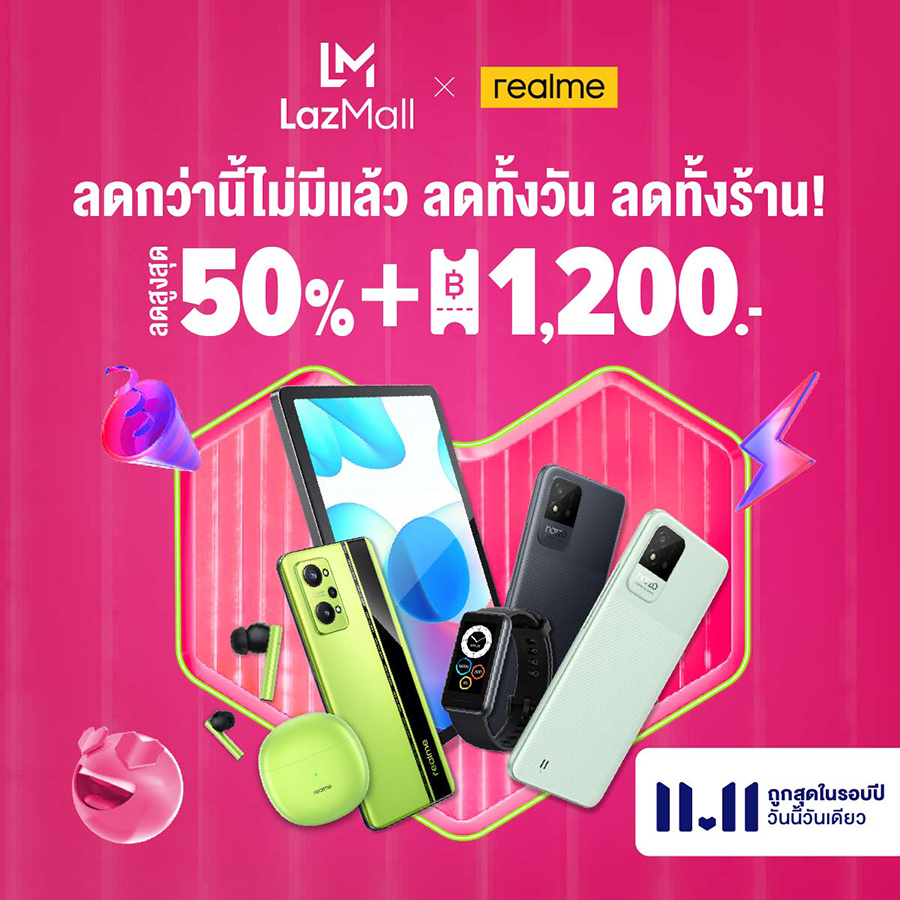 realme แบรนด์สมาร์ตโฟนเพื่อคนรุ่นใหม่ที่เติบโตเร็วที่สุดในโลก ยกขบวนสินค้าสมาร์ตโฟนและ AIoT ลดกระหน่ำแบบจัดเต็มในแคมเปญ 11.11 realme MEGA SALES ลดสูงสุด 50% แถมโค้ดลดสูงสุด 1,200 บาท ในวันที่ 11 พฤศจิกายน 2564 เตรียมพบสินค้าสมาร์ตโฟนหลากหลายรุ่นและแกดเจ็ตสุดล้ำที่จะทำให้คุณได้สัมผัสกับ Smart Life ในราคาคุ้มค่าที่สุดแห่งปี!