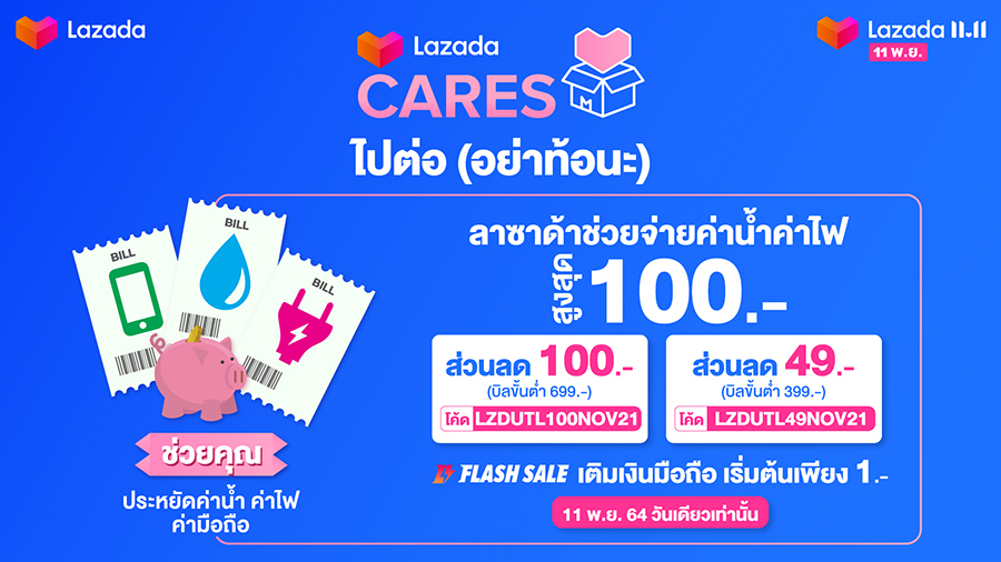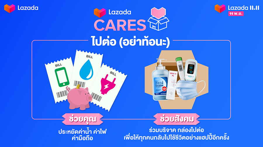 ลาซาด้า ประเทศไทย เปิดตัวมหกรรมช้อปแห่งปี "Lazada 11.11 Our Biggest One-Day Sale ถูกที่สุดในรอบปี วันนี้วันเดียว" ที่มาพร้อมดีลสุดยิ่งใหญ่ที่จะช่วยผู้บริโภคชาวไทยในการปรับตัวสู่วิถีชีวิตแบบ 'นิวนอร์มอล' กันอีกครั้ง ในขณะเดียวกัน โครงการ "LazadaCARES ไปต่อ อย่าท้อนะ" ซึ่งต่อยอดจากกิจกรรมที่ริเริ่มขึ้นในช่วงแคมเปญ LazMall 9.9 Mega Brands Sale ยังจะใช้โอกาสนี้ในการผลักดันการส่งต่อกล่องแห่งความห่วงใยให้กับผู้ที่ขาดแคลน โดยภายในกล่องประกอบด้วยอุปกรณ์และผลิตภัณฑ์ที่จำเป็น เช่น หน้ากากอนามัยและชุดตรวจโควิด-19 เพื่อเสริมการป้องกันให้กับผู้ที่ได้รับความเดือดร้อน ในช่วงเวลาที่หลายคนเตรียมออกจากบ้านไปทำงานอีกครั้ง
