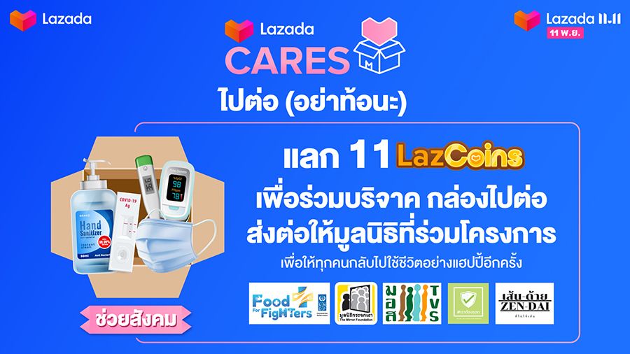 ในช่วงแคมเปญ LazMall 9.9 Mega Brands Sale กล่อง LazadaCARES จำนวน 99,999 กล่องได้ถูกส่งมอบให้กับผู้ที่ได้รับผลกระทบจากโรคโควิด-19 ผ่าน 9 องค์กรการกุศล ลาซาด้าจึงจะต่อยอดโครงการดังกล่าวกับแคมเปญ 11.11 นี้ด้วยเช่นกัน โดยในครั้งนี้ กล่อง LazadaCARES จะบรรจุอุปกรณ์ป้องกันโควิด-19 ที่จำเป็น เช่น ชุดตรวจ RT-Antigen เครื่องวัดออกซิเจน ปรอทวัดไข้ เจลแอลกอฮอล์ และหน้ากากอนามัย ซึ่งจะมีการส่งต่อให้กับผู้ที่เดือดร้อนผ่านความร่วมมือกับมูลนิธิต่างๆ ได้แก่ กลุ่มจิตอาสา Food For Fighters มูลนิธิกระจกเงา มูลนิธิอาสาสมัครเพื่อสังคม เราต้องรอด และเส้นด้าย ผู้บริโภคสามารถร่วมเป็นส่วนหนึ่งของโครงการนี้ผ่านการเปลี่ยนเหรียญ LazCoins จำนวน 11 เหรียญเป็นกล่อง LazadaCARES 1 กล่อง โดยพิมพ์คำว่า “LazadaCARES” บนแถบค้นหาของแอปพลิเคชันลาซาด้า หรือคลิก https://lzd.co/LazadaCARES111121TH