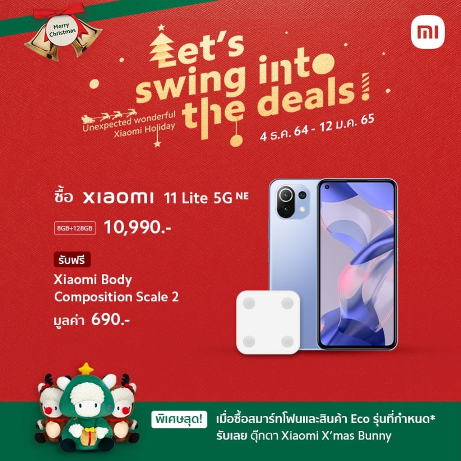 Xiaomi 11 Lite 5G NE (รุ่นความจุ 8GB + 128GB) – สมาร์ทโฟนที่จะมาช่วยให้ทุกคนได้ครีเอทคอนเทนต์ในสไตล์ของตัวเองด้วยกล้องหลังคุณภาพสูงถึงสามตัว อีกทั้งยังเบาบาง พกพาง่าย และมีหลากหลายสีให้เลือกตามสไตล์ที่ชอบใน ราคา 10,990 บาท รับฟรี! Xiaomi Body Composition Scale 2 มูลค่า 690 บาท สามารถซื้อได้ที่ Xiaomi Store และร้านค้าที่ร่วมรายการ