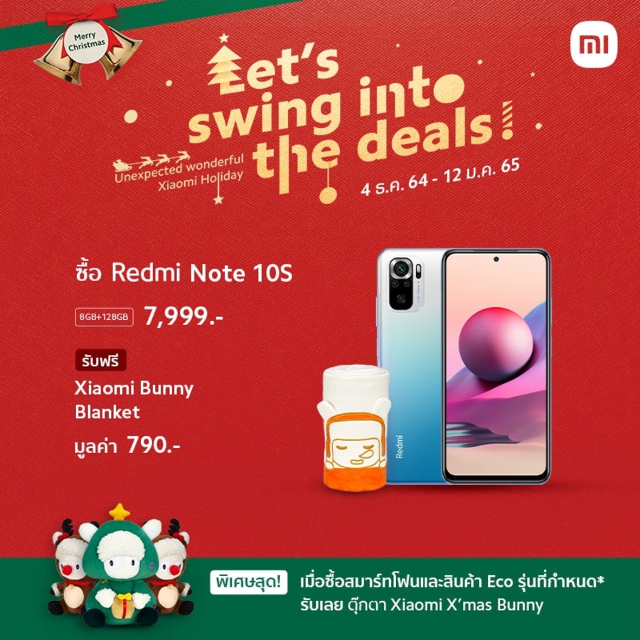 Redmi Note 10S (รุ่นความจุ 8GB + 128GB) - สมาร์ทโฟนระดับ mid-range สุดหรูหราที่จะช่วยยกระดับความบันเทิงของผู้ใช้ พร้อมระบบชาร์จไว 33W ที่สามารถทำให้ใช้งานได้ลื่นไหลตลอดทั้งวันใน ราคา 7,999 บาท รับฟรี! Xiaomi Bunny Blanket มูลค่า 790 บาท สามารถซื้อได้ที่ Xiaomi Store และร้านค้าที่ร่วมรายการ