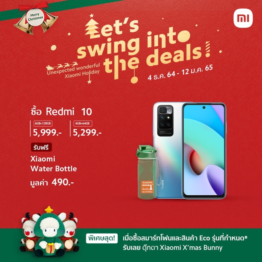 Redmi 10 (รุ่นความจุ 6GB + 128GB และรุ่นความจุ 4GB + 64GB) - สมาร์ทโฟนระดับ mid-range คุณสมบัติ กับฟีเจอร์ที่จัดให้แบบไม่มีกั๊ก ในราคาย่อมเยาเข้าถึงง่าย จากเสียวหมี่ใน ราคา 5,999 บาท สำหรับรุ่นความจุ 6GB + 128GB และราคา 5,299 บาท สำหรับรุ่นความจุ 4GB + 64GB รับฟรี! Xiaomi Water Bottle มูลค่า 490 บาท สามารถซื้อได้ที่ Xiaomi Store และร้านค้าที่ร่วมรายการ