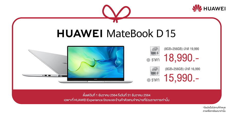 หัวเว่ย คอนซูมเมอร์ บิสสิเนส กรุ๊ป (ประเทศไทย) ปล่อยโปรปลายปีสำหรับสายรักการทำงานแบบมีประสิทธิภาพและการเรียนแบบมืออาชีพ รักการใช้งานแล็ปท็อป กับ HUAWEI MateBook D 15 และ HUAWEI MateBook D 14 แล็ปท็อปเพื่อทุกไลฟ์สไตล์ ตอบโจทย์คนรุ่นใหม่ หน้าจอใหญ่เต็มตา HUAWEI FullView Display ตัวเครื่องทนทานดีไซน์โฉบเฉี่ยว กับราคาเริ่มต้นเพียง 15,990 บาทเท่านั้น