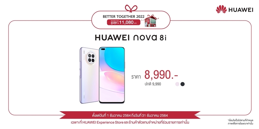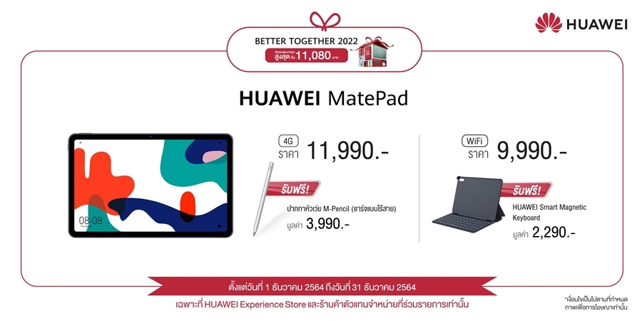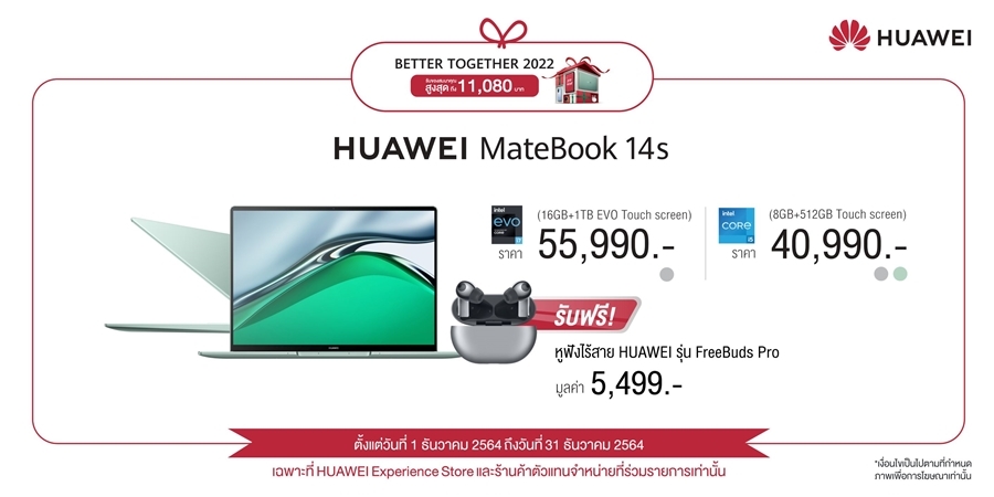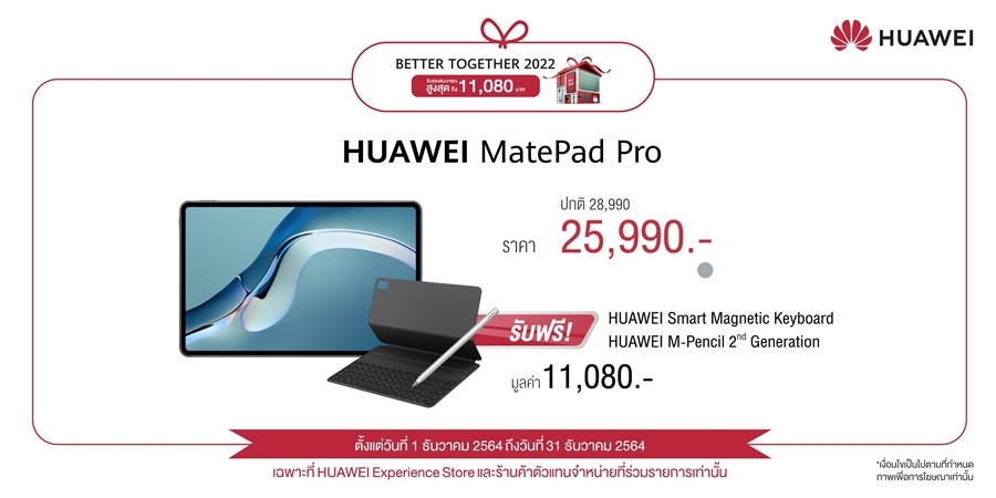 หัวเว่ย คอนซูมเมอร์ บิสสิเนส กรุ๊ป (ประเทศไทย) เปิดโปรเด็ดรับเดือนแห่งเทศกาลส่งมอบความสุข อยู่อย่างห่วงใยไปด้วยกัน ด้วยโปรโมชัน Better Together 2022 นำเสนอสินค้าพร้อมของสมนาคุณสูงสุด 11,080 บาทพร้อมมอบส่วนลดสุดพิเศษสำหรับผลิตภัณฑ์ชั้นนำอีกมากมาย สำหรับผู้ที่ซื้อสินค้าผ่านทางหน้าร้าน HUAWEI Experience Store ร้านค้าตัวแทนจำหน่ายที่ร่วมรายการทั่วประเทศ ตั้งแต่วันที่ 1 ธันวาคม 2564 ถึง 31 ธันวาคม 2564 รวมทั้งซื้อหาได้ทางออนไลน์เริ่มต้นวันที่ 15 ธันวาคม 2564 ถึง 31 ธันวาคม 2564 ที่ HUAWEI Store และร้านค้าออนไลน์อย่างเป็นทางการของหัวเว่ยใน Shopee, Lazada และ JD Central