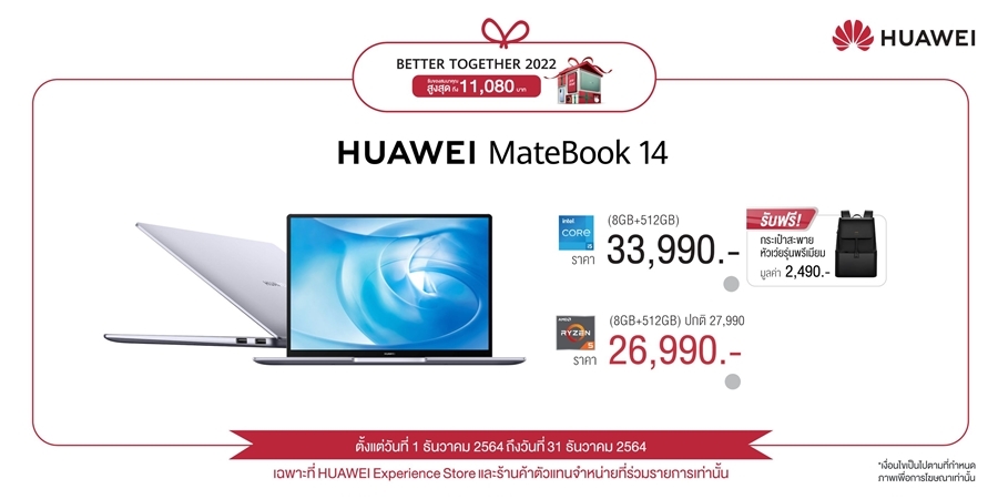 HUAWEI MateBook 14 แล็ปท็อปหน้าจอ HUAWEI FullView Display ความคมชัด 2K รองรับการทำงาน Multi-screen Collaboration ผ่าน HUAWEI Share 3.0 แรงจัดเต็มด้วยขุมพลังรุ่นล่าสุด 11th Gen Intel® Core™ i5 ราคา 33,990 บาท และรุ่น AMD Ryzen 5 มาในราคาพิเศษ 26,900 บาทจากราคาปกติ 27,990 บาท เมื่อซื้อแถมฟรีทันที HUAWEI Backpack มูลค่า 2,490 บาท