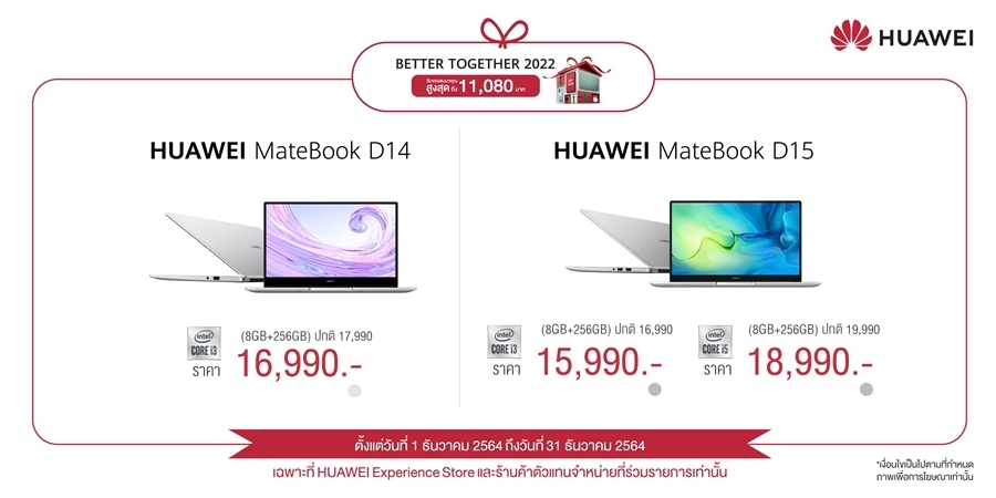 - HUAWEI MateBook D 15 (i3) 8GB+256GB ราคาพิเศษ 15,990 บาท จากราคาปกติ 16,990 บาท
