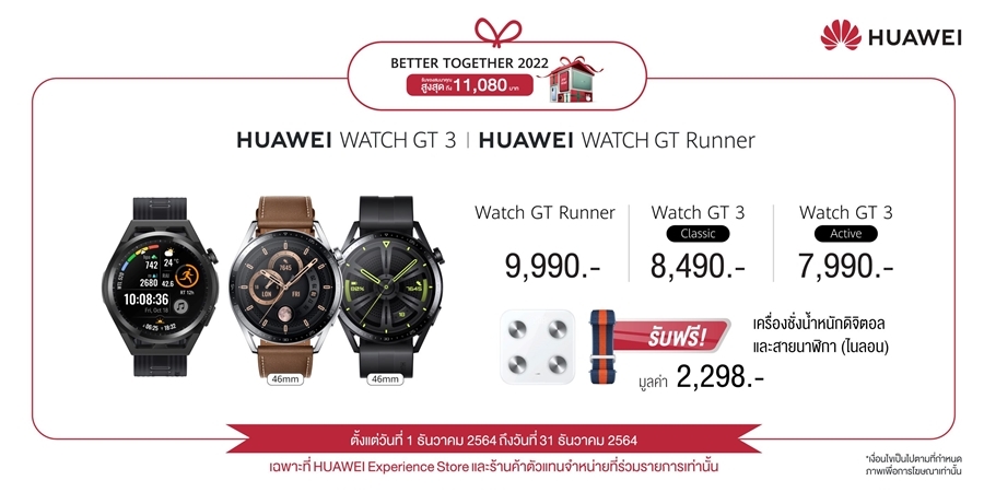 HUAWEI WATCH GT 3 Series ขนาด 46 มม. นาฬิกาสมาร์ทวอทช์ผู้ช่วยอัจฉริยะที่อายุการใช้งานแบตเตอรี่ยาวนานถึง 14 วัน พร้อมความสามารถในการตรวจวัดค่าทางสุขภาพ และฟีเจอร์จัดสรรการออกกำลังกายอัจฉริยะ มีให้เลือก 3 แบบ ได้แก่ Active Edition ราคา 7,990 บาท Classic Edition ราคา 8,490 บาท และ HUAWEI WATCH GT Runner ราคา 9,990 บาท พร้อมรับฟรีสายนาฬิกาไนลอน พร้อมมอนิเตอร์ร่างกายอย่างใกล้ชิด ด้วยเครื่องชั่งน้ำหนัก HUAWEI Body Fat Scale 3 รวมมูลค่าทั้งหมด 2,298 บาท