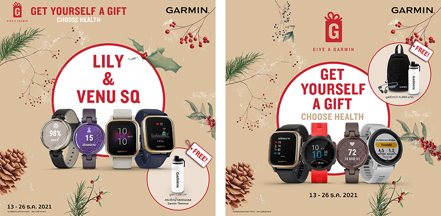 และเมื่อซื้อสินค้าของการ์มินที่ร่วมรายการ กว่า 20 โมเดล จากหลากหลายซีรีย์ ทั้ง VENU SQ SERIES จีพีเอสสมาร์ทวอทช์ที่มาพร้อมดีไซน์สุดทันสมัยเหมาะกับคนที่มีไลฟ์สไตล์รักสุขภาพและชื่นชอบในการออกกำลังกายทั้งชายและหญิง LILY SERIES จีพีเอสสมาร์ทวอทช์ดีไซน์กะทัดรัดที่ออกแบบมาเพื่อตอบโจทย์ผู้หญิงยุคใหม่ที่ใส่ใจในการดูแลตัวเอง FORERUNNER SERIES จีพีเอสสมาร์ทวอทช์ สำหรับสายวิ่งที่ช่วยเพิ่มสีสันให้กับการวิ่งอีกสเต็ป การ์มินพร้อมมอบของขวัญพิเศษส่งท้ายปี อาทิ หูฟังแบบไร้สาย Aftershokz กระเป๋าสะพายข้าง และกระติกน้ำจากการ์มิน รวมมูลค่ากว่า 5,000 บาท ตั้งแต่วันที่ 13 – 26 ธันวาคมนี้เท่านั้น