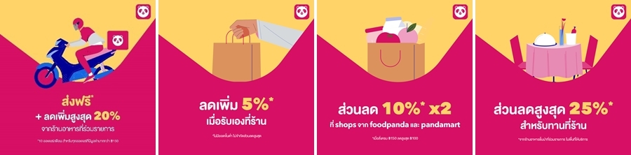 - ส่วนลด 10% สำหรับ pandamart และ foodpanda shops - จำนวน 2 ครั้งต่อเดือน ด้วยยอดสั่งขั้นต่ำ 150 บาท