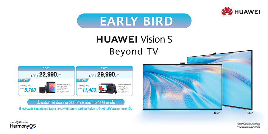สำหรับลูกค้าที่สั่งจอง HUAWEI Vision S รุ่น 55 นิ้ว ราคา 22,990 บาท และรุ่น 65 นิ้ว ราคา 29,990 บาท ตั้งแต่วันที่ 19 ธันวาคม 2564 – 9 มกราคม 2565 ที่ HUAWEI Experience Store, HUAWEI Store และร้านค้าตัวแทนจำหน่ายที่ร่วมรายการเท่านั้น รับของสมนาคุณสุดคุ้มมูลค่าสูงสุด 11,480 บาท* ได้แก่ กล่องรับสัญญาณ True ID Box และ HUAWEI MatePad 4 GB + 64 GB โดยสามารถติดตามรายละเอียดเพิ่มเติมเกี่ยวกับผลิตภัณฑ์ได้ที่ HUAWEI Store หรือผ่านช่องทางของตัวแทนจำหน่ายอย่างเป็นทางการทั้ง JD Central, Shopee และ Lazada