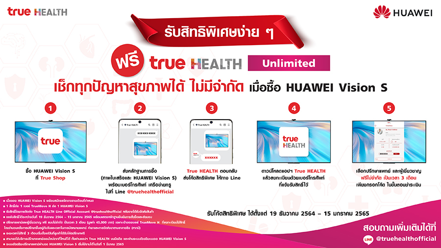 หัวเว่ย คอนซูมเมอร์ บิสสิเนส กรุ๊ป (ประเทศไทย) เดินหน้าผสานนวัตกรรมล้ำสมัยเข้ากับเทคโนโลยีสารสนเทศทางการแพทย์เพื่อดูแลสุขภาพและให้คำปรึกษาผ่านระบบโทรคมนาคม หรือ “Telehealth” ซึ่งทำให้ผู้คนเข้าถึงบริการสุขภาพและบริการทางการแพทย์ได้ง่ายและสะดวกสบายยิ่งขึ้น โดยไม่ต้องไปคลินิกหรือโรงพยาบาล มอบเอกสิทธิ์ให้กับลูกค้าที่ซื้อ HUAWEI Vision S จากทรูช้อป พร้อมสมัครแพ็คเกจรายเดือนที่กำหนด รับสิทธิ์ปรึกษาปัญหาสุขภาพเบื้องต้นผ่านแอปพลิเคชัน True HEALTH บนสมาร์ทโฟน สามารถวิดีโอคอลกับแพทย์และผู้เชี่ยวชาญมากกว่า 350 ท่าน ครอบคลุมกว่า 20 สาขา โดยไม่มีค่าใช้จ่ายในการปรึกษาและไม่จำกัดจำนวนครั้งเป็นเวลา 3 เดือน เริ่มตั้งแต่วันที่ลูกค้าได้รับโค้ดปรึกษาฟรี พร้อมบริการส่งยาและผลิตภัณฑ์สุขภาพให้ถึงบ้าน โดยลูกค้าสามารถติดต่อขอรับสิทธิและสอบถามรายละเอียดเพิ่มเติมได้ทาง Line Official Account @truehealthofficial ตั้งแต่วันที่ 19 ธันวาคม 2564 – 15 มกราคม 2565 และเริ่มใช้งาน True HEALTH บน HUAWEI Vision S ได้ตั้งแต่วันที่ 1 มีนาคม 2565 เป็นต้นไป