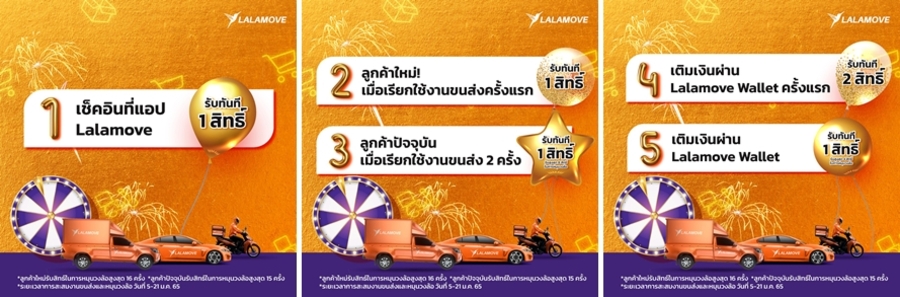 ลูกค้าสามารถเลือกใช้บริการรับ–ส่งสินค้าตามความต้องการ (on-demand delivery service) จากลาลามูฟในราคาสุดพิเศษผ่านแอปพลิเคชัน LALAMOVE หรือดาวน์โหลดได้ที่ https://bit.ly/3h0te02 พร้อมร่วมสนุกกับแคมเปญ LALA 2022 ยิ่งใช้ยิ่งมีสิทธิ์มาก! หมุนวงล้อชิงของสมนาคุณสุดพิเศษ ตั้งแต่วันที่ 5 – 21 มกราคม 2565 รายละเอียดเพิ่มเติม คลิก!