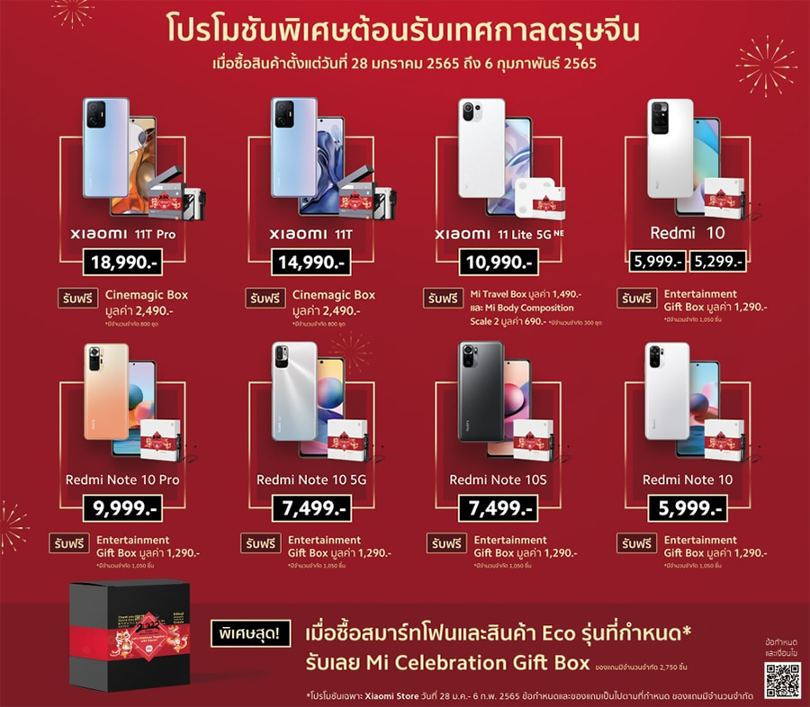 เสียวหมี่ ผู้นำเทคโนโลยีระดับโลก ต้อนรับปีเสือทอง ส่งโปรโมชั่นสุดพิเศษเนื่องในเทศกาลตรุษจีน ยกทัพสมาร์ทโฟนหลากหลายรุ่น ได้แก่ Xiaomi 11T Series, Xiaomi 11 Lite 5G NE, Redmi Note 10 Series และ Redmi 10 ให้เลือกสรรเป็นของขวัญต้อนรับเทศกาลมงคลในปีนี้ ตั้งแต่วันที่ 28 มกราคม – 6 กุมภาพันธ์ 2565 ณ Xiaomi Store ทุกสาขาทั่วประเทศ