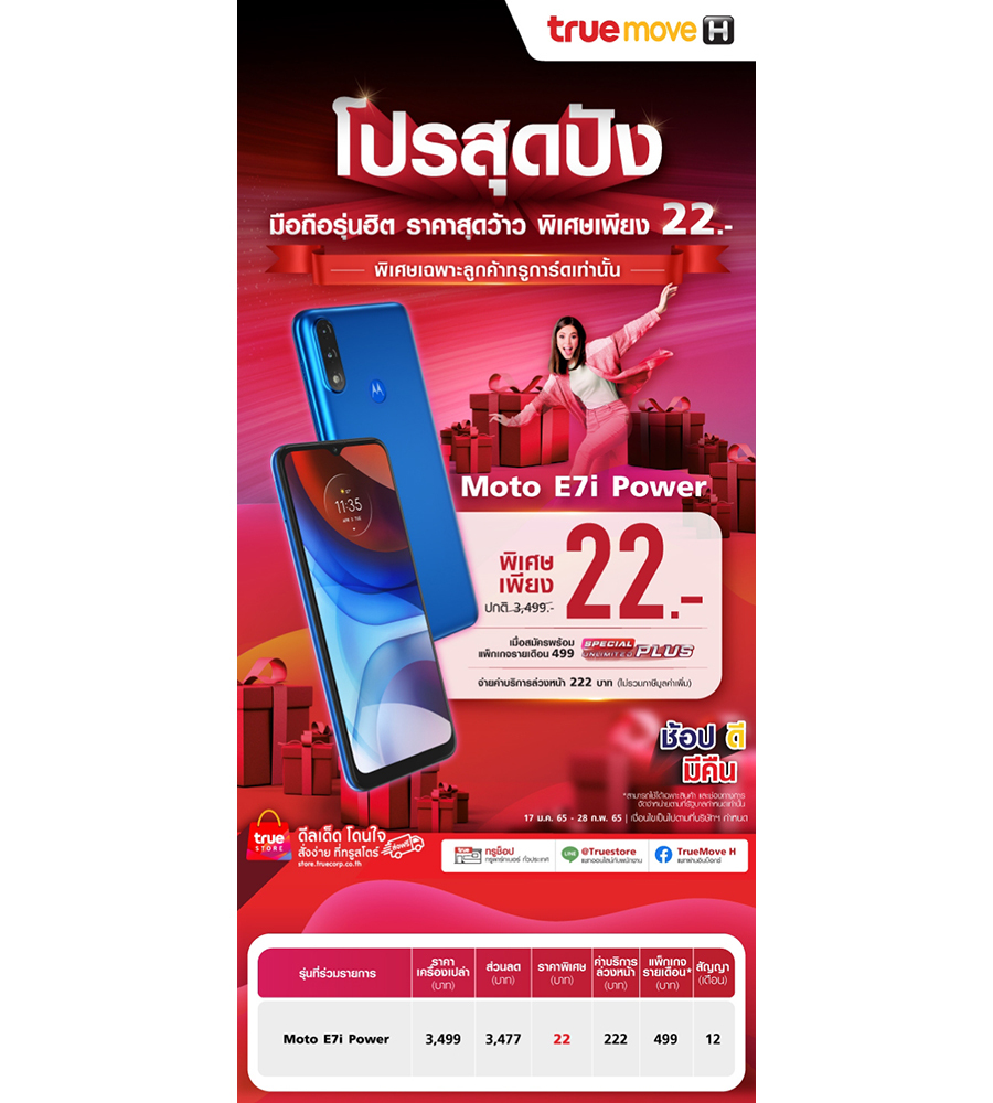 ลูกค้าทรูการ์ด (ทุกสี) ช้อป Moto E7i Power จ่ายค่าเครื่องเพียง 22 บาท (จากปกติ 3,499 บาท) เมื่อซื้อพร้อมสมัครแพ็กเกจ Special Unlimited Plus เริ่มต้น 499 บาทต่อเดือน สัญญานาน 12 เดือน และชำระค่าบริการล่วงหน้า 222 บาท พร้อมใช้สิทธิ์ ช้อปดีมีคืน คืนภาษีสูงสุดถึง 10,500 บาท