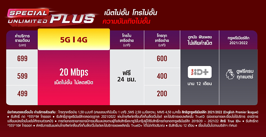 - แพ็กเกจ Special Unlimited Plus ใช้เน็ตได้ไม่จำกัดปริมาณ ไม่ลดสปีด ที่ความเร็วสูงสุด 20Mbps โทรในเครือข่ายทรูฟรี 24 ชั่วโมง โทรทุกเครือข่ายฟรีสูงสุด 600 นาที ตามเงื่อนไขแพ็กเกจ ดูหนัง ฟังเพลงผ่าน TrueID ไม่เสียค่าเน็ต นาน 12 เดือน และดูทรูพรีเมียร์ลีก 2021/2022 ฟรีครบทุกแมตซ์