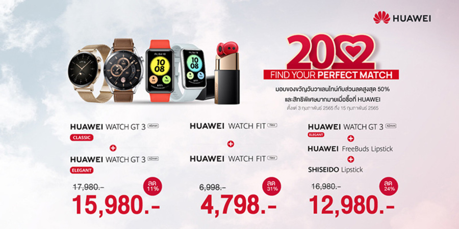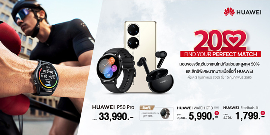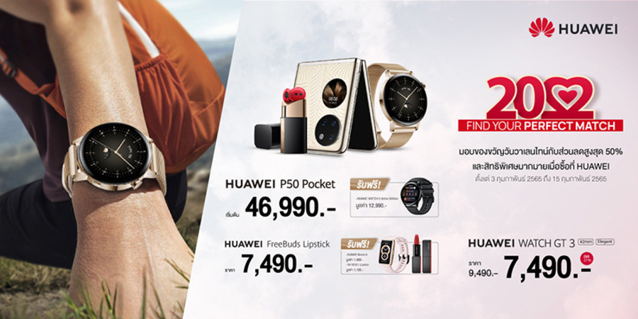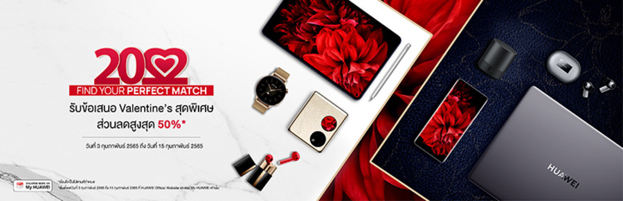 หัวเว่ย คอนซูมเมอร์ บิสสิเนส กรุ๊ป (ประเทศไทย) ต้อนรับเทศกาลแห่งความรักด้วยโปรโมชันจัดเต็มลดราคาสูงสุด 50% เชิญชวนคนมีความรักเลือกซื้อสินค้าไอทีที่เหมาะแก่การซื้อเป็นของขวัญให้คนที่คุณรัก แม้ตัวอาจจะยังห่างไกลแต่ใจยังไม่ห่าง โดยจัดขบวนสินค้ามาลดราคาครอบคลุมหลายกลุ่มผลิตภัณฑ์ ทั้งอุปกรณ์สวมใส่อัจฉริยะ หูฟัง และแท็บเล็ต โดยเลือกสรรมาให้ในหลากหลายระดับราคา เอาใจผู้บริโภคทุกกลุ่ม ไม่ว่าจะมองหาของขวัญเซอร์ไพรส์คนที่แอบชอบมานาน หรือหาของแทนความรักความห่วงใยให้คนข้างๆ รับรองว่าหัวเว่ยมี "Perfect Match" ในราคาที่คุ้มค่ารออยู่ที่เว็บไซต์ HUAWEI Store และแอปพลิเคชัน My HUAWEI ช้อปเลยตั้งแต่วันที่ 3 - 15 กุมภาพันธ์ 2565