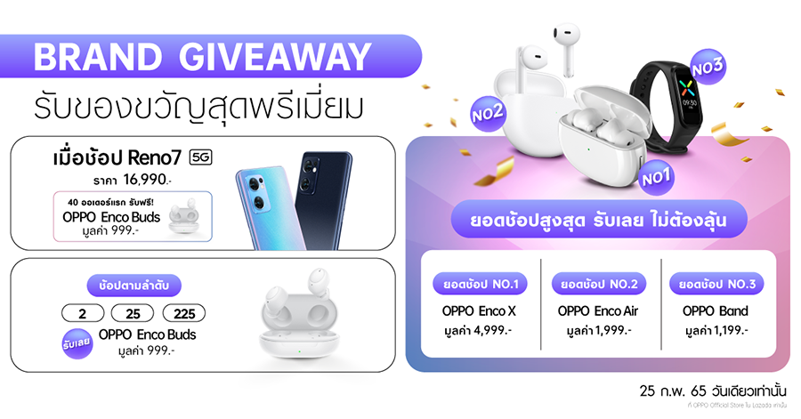 Special Giveaway เมื่อซื้อของตามออเดอร์ที่กำหนด รับเลย ของแถมสุดพิเศษ เมื่อซื้อ OPPO Reno7 5G 40 ออเดอร์แรก หรือเมื่อซื้อสินค้าเป็นออเดอร์ลำดับที่ 2, 25 และ 225 รับเลย OPPO Enco Buds มูลค่า 999 บาท และเมื่อซื้อสมาร์ทโฟน 30 ออเดอร์แรก รับเลย พัดลมตั้งโต๊ะ มูลค่า 1,000 บาท