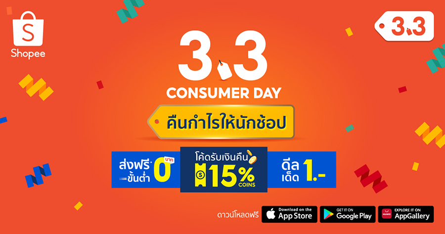 เตรียมสะสม Shopee Coins กดแจ้งเตือนสินค้า Flash Sale และลงทะเบียนสมัครใช้งาน SPayLater ให้พร้อม แล้วไปสัมผัสปรากฏการณ์ความคุ้มค่าที่ดีต่อใจดีต่อเงินในกระเป๋าพร้อมกันในมหกรรม Shopee 3.3 Consumer Day คืนกำไรให้นักช้อป ในวันที่ 3 มีนาคม 2565 ที่ช้อปปี้ได้แท็กทีมร้านค้าและแบรนด์ชั้นนำบน Shopee Mall อาทิ L’Oreal Paris, Garnier, Maybelline, Hisense, Lotus Mattress, Dunlopillo, Tefal, Dodolove, และ Lotus’s และอีกมากมาย มาผนึกกำลังคืนกำไรให้นักช้อป พร้อมอัดโปรแรงแห่งปี ทั้งโค้ดส่งฟรีขั้นต่ำ 0 บาท โค้ดรับเงินคืน 15% coins และดีลเด็ด 1 บาท ที่ได้รวมสินค้าตัวดังมากมายมาลดสะบั้นหั่นราคาเหลือเพียง 1 บาท เท่านั้น ไม่ว่าจะเป็น สมาร์ทโฟน Xiaomi Redmi 10, ดิจิทัลทีวีขนาด 32 นิ้ว และตู้เย็นขนาด 3.4 Q จาก Hisense, เครื่องชงกาแฟสดจาก Duchess, เครื่องดูดไรฝุ่นจาก Deerma, Innisfree Green Tea Seed Serum, โซฟาปรับนอนได้จาก HAKONE เป็นต้น นอกจากนี้นักช้อปยังจะได้เต็มอิ่มไปกับสิทธิพิเศษเพิ่มเติมเมื่อชำระเงินผ่าน ShopeePay และ SPayLater