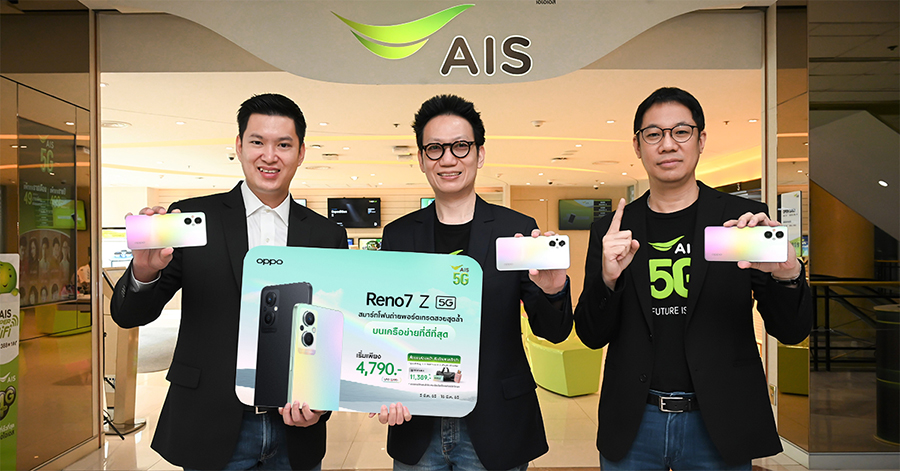 OPPO ผนึกกำลังกับ เอไอเอส นำโดย คุณทวีเกียรติ ธัญญวัฒนกุล หัวหน้าแผนกงานบริหารธุรกิจอุปกรณ์สื่อสาร และคุณทิฐินันท์ โชตินันทน์ หัวหน้าแผนกงานการตลาดด้านผลิตภัณฑ์ บริษัท แอดวานซ์ อินโฟร์ เซอร์วิส จำกัด (มหาชน) หรือ AIS จับมือผนึกกำลังกับพันธมิตร คุณชานนท์ จิรายุกุล ประธานกรรมการอาวุโสฝ่ายบริหาร ออปโป้แห่งประเทศไทย เปิดจอง OPPO Reno7 Z 5G สมาร์ทโฟน 5G ที่ถ่ายภาพพอร์ตเทรตได้ดีที่สุด ในราคาสุดคุ้มเริ่มต้นเพียง 4,790 บาท พร้อมข้อเสนอสุดพิเศษมากมาย เมื่อจองผ่านเอไอเอส ตั้งแต่วันนี้ - 16 มีนาคมนี้