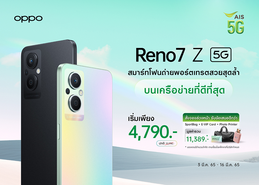 เป็นเจ้าของ OPPO Reno7 Z 5G ในราคาที่คุ้มค่ามากกว่าเดิม กับโปรโมชั่นสุด Exclusive เมื่อจองผ่านเอไอเอส ที่เอไอเอสช็อปและร้านเทเลวิซทุกสาขา ตั้งแต่วันนี้ - 16 มีนาคม