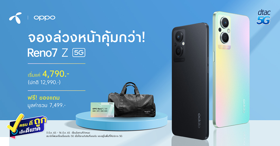 พร้อมให้คุณเป็นเจ้าของ OPPO Reno7 Z 5G ในราคาสุดคุ้มเริ่มต้นเพียง 4,790 บาท พร้อมข้อเสนอสุดเอ็กซ์คลูซีฟจากดีแทคมากมายที่ศูนย์บริการดีแทคทั่วประเทศ หรือ dtac online store ตั้งแต่วันนี้ – 16 มีนาคม 2565