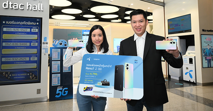 OPPO ผู้นำตลาดสมาร์ทโฟนไทย นำโดย คุณชานนท์ จิรายุกุล รองประธานกรรมการอาวุโสฝ่ายบริหาร ออปโป้แห่งประเทศไทย ร่วมมือกับพันธมิตร ดีแทค นำโดย คุณพลอย จาตุกัญญาประทีป ผู้อำนวยการอาวุโส ฝ่ายการตลาดและผลิตภัณฑ์รายเดือน และช่องทางการจัดจำหน่าย บริษัท โทเทิ่ล แอ็คเซ็ส คอมมูนิเคชั่น จำกัด (มหาชน) หรือดีแทค เปิดจอง OPPO Reno7 Z 5G ในราคาเริ่มต้นเพียง 4,790 บาท พร้อมโปรโมชันสุดคุ้มและสิทธิพิเศษมากมายที่ศูนย์บริการดีแทคที่ร่วมรายการ ตั้งแต่วันนี้ - 16 มีนาคม 2565