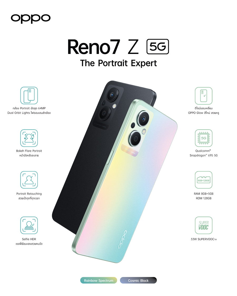 OPPO Reno7 Z 5G สานต่อความสามารถของ OPPO Reno Series ในด้านการถ่ายพอร์ตเทรตระดับมืออาชีพ สามารถถ่ายภาพพอร์ตเทรตคุณภาพสูงของอุตสาหกรรมราวกับถ่ายด้วยกล้อง DSLR ตอบโจทย์ผู้ใช้ยุคโซเชียล เพิ่มลูกเล่นสนุกและสวยงามยิ่งขึ้นด้วยฟีเจอร์ Bokeh Flare Portrait ที่ทำงานร่วมกับอัลกอริทึม AI ช่วยเบลอพื้นหลังพร้อมมอบดวงไฟโบเก้ฟุ้งละมุนแบบอัตโนมัติ และได้รับการอัปเกรดความสามารถในการตรวจจับบุคคลและตัดภาพบุคคลจากพื้นหลังได้อย่างคมชัดแม้กระทั่งเส้นผม โดยรองรับการถ่ายภาพนิ่งทั้งกล้องหน้าและกล้องหลัง นอกจากนี้ด้วยอัลกอริทึมอันชาญฉลาดยังทำให้ฟีเจอร์ Portrait Retouching มอบเอฟเฟ็กต์ปรับผิวหน้า โทนสีผิว หรือแต่งหน้าได้สวยงามอย่างเป็นธรรมชาติทั้งการถ่ายภาพนิ่งและวิดีโอพอร์ตเทรตอีกด้วย พร้อมให้ถ่ายพอร์ตเทรตด้วยกล้องหน้าได้สว่างคมชัดแม้ในที่แสงน้อยหรือย้อนแสงด้วยฟีเจอร์ Selfie HDR เพิ่มช่วงไดนามิกภาพพอร์ตเทรตด้วยกล้องหน้าให้สามารถคงรายละเอียดของใบหน้าและพื้นหลังได้อย่างแม่นยำ โดย OPPO Reno7 Z 5G มาพร้อมกล้องหลัง 3 กล้อง ความละเอียดสูงสุด 64MP
