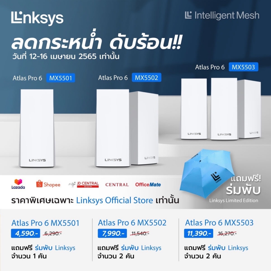 พร้อมกันนี้เรายังมีโปรโมชั่นเมื่อซื้อเราเตอร์ Linksys รุ่นอื่นๆ ในทุกช่องทางการจัดจำหน่าย รับไปเลยร่มพับไซส์มินิ Linksys Limited Edition ตั้งแต่วันที่ 11 เม.ย. - 8 พ.ค. 65 เท่านั้น โดยมีรุ่นที่ร่วมรายการดังนี้