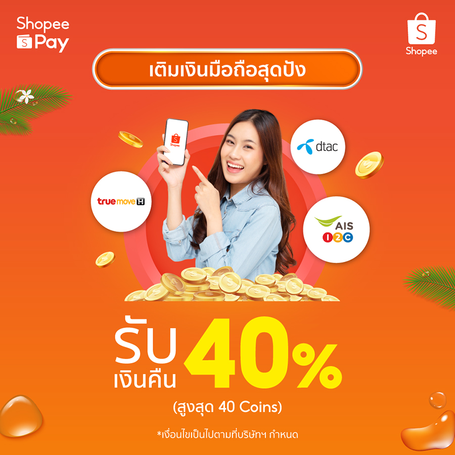 • เติมเน็ตแรง ๆ เตรียมอัพรูปอวดโลกโซเชียล ออกจากบ้านไปเที่ยวทั้งทีต้องเติมเน็ต เติมเงินค่าโทรให้พร้อม แค่เติมผ่าน ShopeePay รับเลย Shopee Coins Cashback สูงสุดถึง 40%
